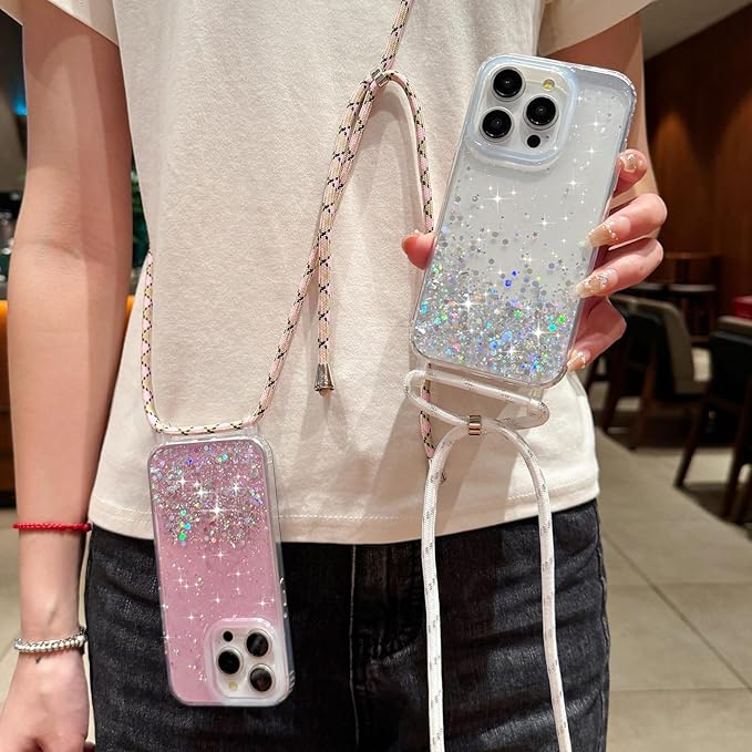 LCHULLE 用の iPhone 15 Pro Max ケース キラキラ ラメ ショルダー ストラップ付き カバー かわいい グリッター 女の子 韓国 おしゃれ 斜めかけ 肩掛け 軽量 耐衝撃 TPU 落下防止 ネックストラップ 長さ調整可能 用の アイフォン 15 Pro Max スマホケース(透明)