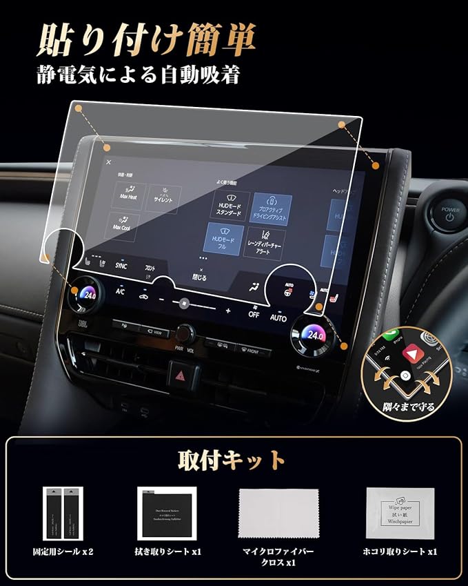 【簡単貼り付け、気泡防止設計】 付属のツールを使い、手順に従って数分で安全な画面保護を施せます。<br> ※気泡の原因となるホコリや汚れを取り除くため、取り付け前に画面をよく清掃してください。また、車内へのホコリの侵入を防ぐため、窓を閉めた状態での作業をおすすめします。気泡が残った場合は、軽く押し出すことで簡単に取り除けます。