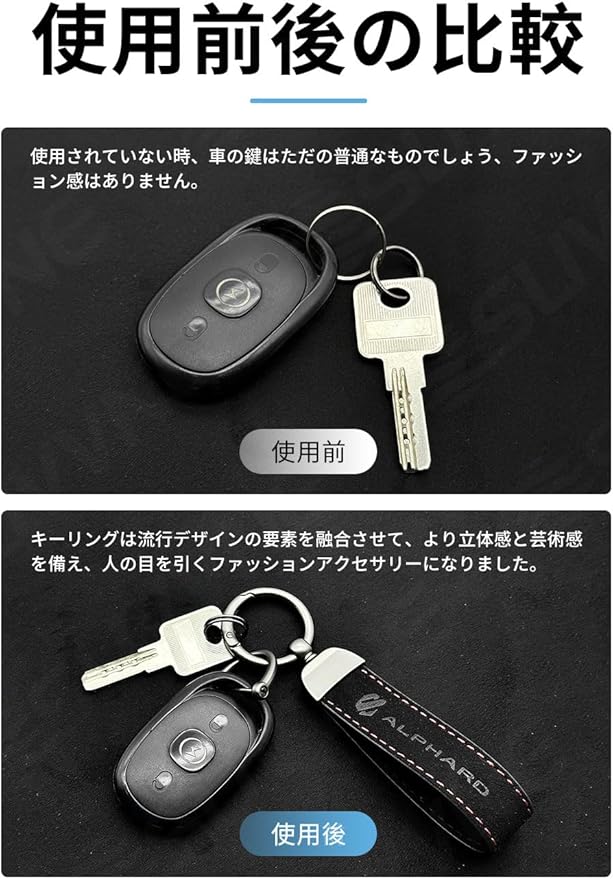 [対象機種]:適合アルファード 40系ALPHARD AAHH40W AAHH45W (2023年6月~現行)。[ALPHARD]は押し印刷工芸のキーリングを採用して、独特の魅力と熟練された工芸を尽くしています。[パッケージ内容] キーホルダー*1、Oリング*2、Dリング*1、マイナスドライバー*1、日本語取扱説明書*1