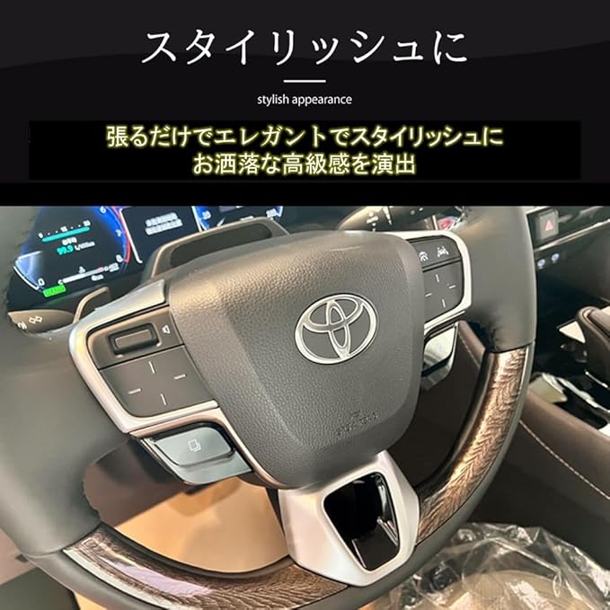 40系アルファード/ヴェルファイア専用設計!純正ステアリングに被せるだけで、車内空間をワンランク上の高級感へと導くABS製ハンドルカバーです。 洗練されたデザインと選べる3色のカラーバリエーションで、あなたの愛車をさらに個性的に演出。 高品質ABS樹脂を採用し、耐久性とフィッティング精度を追求しました。手軽に装着できるため、DIY初心者の方にもおすすめです。 商品説明詳細: ・高級感溢れるデザイン:** 純正ステアリングに自然に調和するスタイリッシュなデザイン。インテリアの雰囲気を高め、運転中の満足度を高めます。 ・高品質ABS樹脂:** 耐久性に優れた高品質ABS樹脂を採用。傷や汚れに強く、美しい状態を長く保ちます。 ・選べる3色 (1)ピアノブラック:** 上質な光沢が高級感を演出。 (2)カーボン調:** スポーティーで洗練された印象。 (3)シルバー:** シックで落ち着いた雰囲気。 ・簡単取り付け: 裏面に強力な両面テープを施工済み。ステアリングに被せるだけで、簡単に装着できます。専門工具は不要です。 ・専用設計: 40系アルファード/ヴェルファイアのステアリング形状に合わせた専用設計。高いフィッティング精度を実現しています。 --- 【適合】 ・トヨタ アルファード 40系 (2023年6月~) ・トヨタ ヴェルファイア 40系 (2023年6月~) 【仕様】 素材:ABS樹脂 カラー:ピアノブラック、カーボン調、シルバー セット内容:ハンドルカバー本体 1 取付方法:両面テープによる貼り付け (貼り付け前に脱脂を行ってください) 【取り扱い方】 1. 取り付け箇所の汚れや油分を、中性洗剤などで綺麗に拭き取ってください。 2. 仮合わせを行い、フィッティングを確認してください。 3. 両面テープの剥離紙を剥がし、しっかりと圧着してください。 4. 貼り付け後、24時間は走行を控え、テープの粘着力を安定させてください。 【注意事項】 ・グレードや年式により、ステアリング形状が異なる場合がございます。必ず現車のステアリング形状をご確認の上、ご購入ください。 ・両面テープの粘着力が弱い場合は、別途両面テープをご用意ください。 ・走行前に必ずしっかりと装着されているか確認してください。 ・輸入品のため、輸送時に細かな傷等が付く場合がございます。予めご了承ください。 【その他】 ・商品の画像は、お使いのモニターやブラウザによって色味が異なって見える場合がございます。 ・ご不明な点がございましたら、お気軽にお問い合わせください。