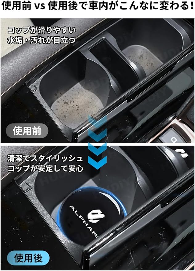 【撥水防塵】レジン表面の撥水加工により、コーヒーや清涼飲料などをこぼしても液体をはじき、サッと拭くだけで清潔を保てます。また、ホコリが付着しにくいため、カップホルダー周りのほこり対策にも効果的です。面倒なメンテナンスから解放され、いつでも清潔な車内を維持できます。