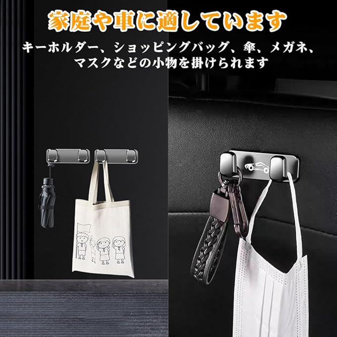【ダブルフックデザイン】本フックには2つのフックがあり、手提げ袋、ショッピングバッグ、朝食バッグ、データケーブル、鍵など、さまざまな小物の収納に適しています。ダブルフックデザインは、特にデータケーブルなどの小物を絡まないように収納でき、車内を整理整頓し、物が整然と収納され、取り出しやすくします。