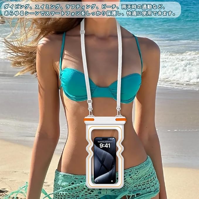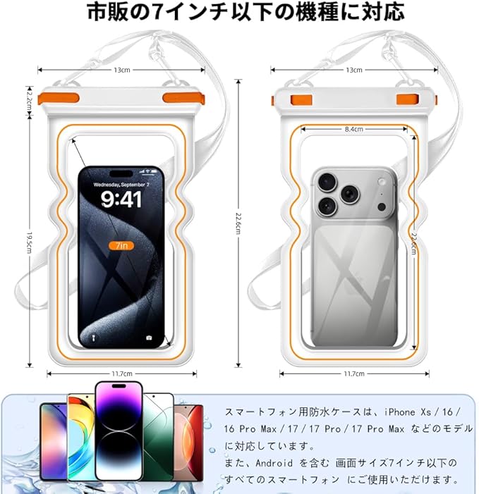【各種認証取得で安心|7インチ以下の機種に対応】IPX8国際防水認証を取得。さらにBSCI、REACH、ROHS、ISO9001などの各種認証をクリアしています。本製品は iPhone Xs/16/16 Pro Max/17/17 Pro/17 Pro Max などに対応し、Androidを含む画面サイズ7インチ以下のすべてのスマートフォンでご使用いただけます。適用:アウトドア、ダイビング、砂浜、釣り、水泳。