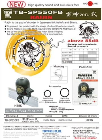 雷神(RAIJIN):「雷神」が轟かす大きな雷鳴が、遠くまで鳴り響く音を連想し製品名称に。 ・国内規格JISと国際規格ISOをクリアしており85dB 以上の音圧です。 ・スポーツバイクに乗られる、より幅広いユーザーに雷神ベルを使用していただきたく、 O-ring ゴムを使用しハンドル取付径φ22.2/φ25.4/φ31.8mmに取付可能な製品開発を行ないました。 ・高速走行中に危険防止の為にベルを使用する際に、大きな音圧で離れた距離まで音が確認出来ます。 ・高品質の大きな音で、自転車に乗るあなたに大きな安全を。