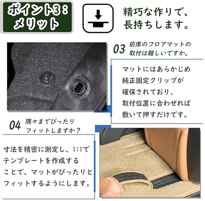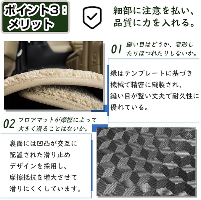 【メリット】: ①[丈夫]縁はテンプレートに基づき機械で精密に縫製され、縫い目が整い丈夫で耐久性に優れている。 ②[滑り止め]裏面には凹凸が交互に配置された滑り止めデザインを採用し、摩擦抵抗を増大させて滑りにくくしています。 ③[取付簡単]マットにはあらかじめ純正固定クリップが確保されており、取付位置に合わせれば敷いて押すだけです。 ④[フィット]寸法を精密に測定し、1:1でテンプレートを作成することで、マットがぴったりとフィットするようにします。