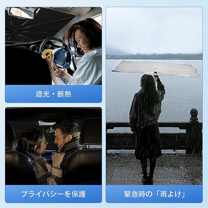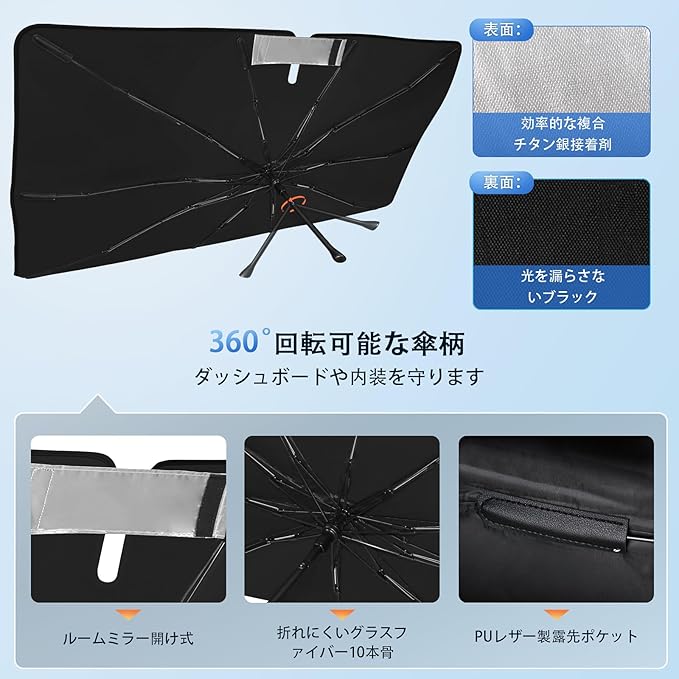 【細部にこだわった仕様】中棒は頑丈な10本の傘骨にグラスファイバーと航空機用アルミ合金を使用しました。耐久性に優れています。各傘骨の末端にPUレザー製の露先ポケットがありますので、車の内装を傷つける心配はありません。傘柄は180 折り曲げ可能かつ360 回転可能なのでセットした後邪魔になりません。