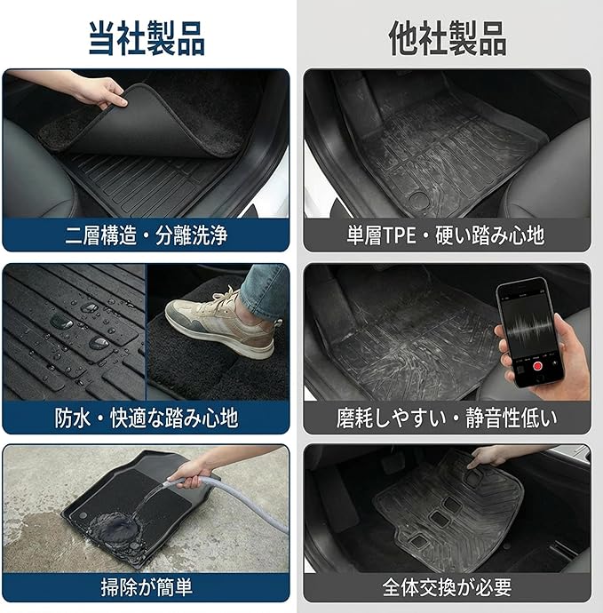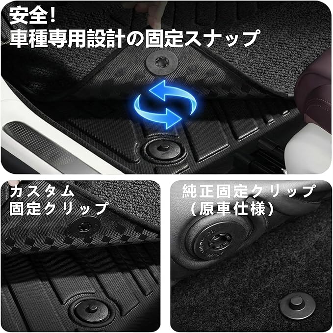 ✅【工具不要・簡単取付】 純正フロアアンカー対応設計。 滑り止め固定構造により、工具不要で簡単装着。 走行中のズレや浮き上がりを防止します。 ※折り畳み梱包のため、到着後はぬるま湯またはドライヤーで温めると形状が元に戻ります。