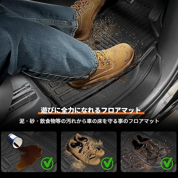 【3D立体構造】普通のフロアマットより、本製品カーマットは縁の部分が壁のように高く立ち上がっているので雨などの水や汚れが隙間から車の床に染み込むのを防ぎ、快適に使用できます。また、TPE素材で耐汚性・防水性に優れ、水滴や汚れが簡単に拭き取れるため、アウトドア、キャンプ、お釣りなどを楽しむ方にもおすすめです。