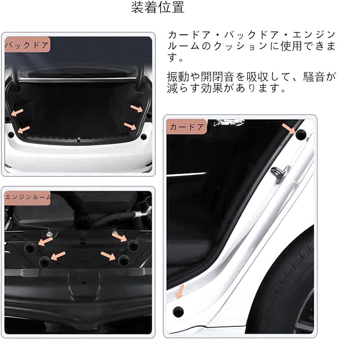 騒音低減 :本製品は車のドアが閉まる際に発生する衝撃を効果的に緩和し、車のドアが閉まる際の騒音や振動を減少させ、 車内の静けさと快適性を向上させることができます。