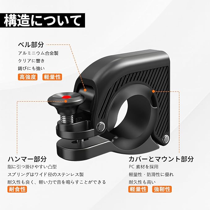 【アルミ合金製&耐久性抜群】自転車ベルの本体は耐摩耗性に優れたABS樹脂と軽量で頑丈なアルミ合金を採用。コンパクトで防水・防錆仕様であり、雨の日も長期間の使用でも、確かな性能を維持します。