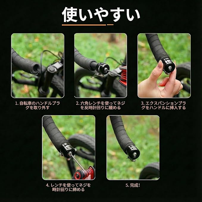 【カンタン3ステップ取り付け】専用工具付属で、難しい作業は一切不要。①元のバーエンドキャップを外す。②拡張ボルトをハンドルに差し込む。③付属の六角レンチでネジを締める。たったの3ステップで、約1分で完了します。