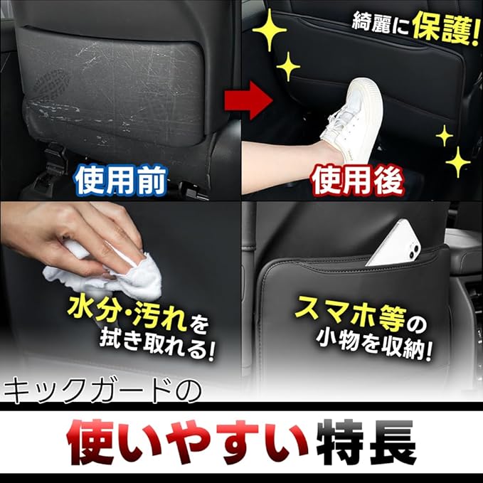 お子様を後部座席に座らせると足をバタバタ動かすことで、意図せず足跡が付いたり傷が付くことも。新車を購入したての方やシートバックの傷/汚れが気になる方にお勧めのキックガードです。
