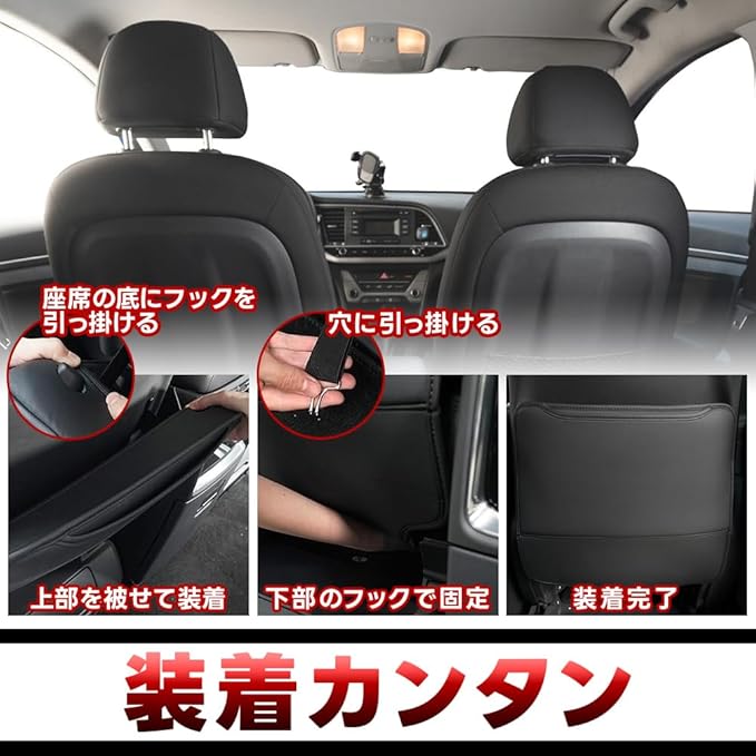《取り付け方法》1:設置前にタオルで埃や油分を拭き取ります。2:本体をシートの背もたれに掛けます。3:本体に付いているフックをシート下部に固定したら設置完了です。