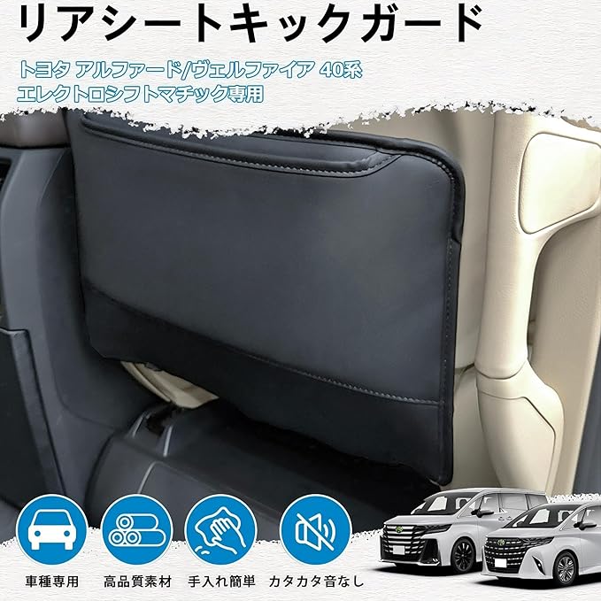アルファード40系・ヴェルファイア40系の後部座席をプロ級ガード!2023年モデル以降のシート形状に完全対応した専用シートバックカバーが登場! お子様の元気な足跡や荷物の摩擦から、愛車の高級シートをしっかりプロテクトします✨ なぜ選ばれる? 3大ポイント① 完全フィット設計メーカー純正シートの立体形状を再現! 隙間なくピッタリ装着されるから、高級車の美しいインテリアラインを損ないません ② 汚れを寄せ付けない高機能素材0.1mm単位の高密度人工皮革が、飲み物こぼれ・砂埃・靴のスレ汚れをブロック! 雑巾でサッと拭くだけでメンテナンス完了 ③ 収納&見た目が両方アップグレードA4サイズ書類も入る深めポケットで車内整理をサポート♪ シックなブラックカラーがアルファード/ヴェルファイアの上質な室内空間に溶け込みます✨ 装着は超簡単ステップ2つ!1.シートバックにカバーをかぶせる2.フックを座席下部に引っ掛ける→ たったこれだけで完了! 車種知識がなくても誰でも10秒で設置可能です セット内容キックガード 2(左/右用)※本品は車内装飾用アクセサリーであり、衝突安全性を保証するものではありません。今こそ後部座席の「永遠の新車感」を手に入れよう!