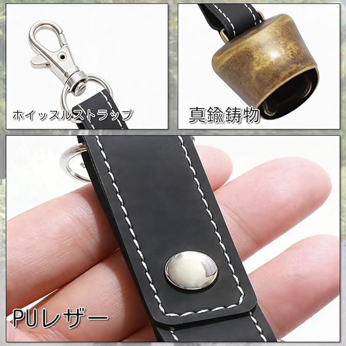 1.【製品仕様】 セット内容:熊鈴 1個、ホイッスル 1個 材質:熊鈴 - 真鍮鋳物、ホイッスルストラップ - 人工皮革(PUレザー) 重量:約57g(セット全体)