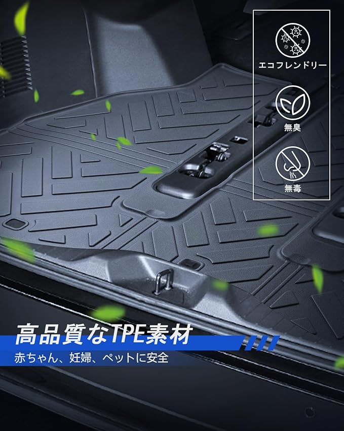 【3D立体デザイン&熱可塑性TPE素材】3D立体仕様のマット表面は、砂や汚れが広がるのを防ぎ、走行中の荷物の滑りをしっかりと抑えます。素材には熱可塑性エラストマー(TPE)を使用しているため、優れた耐熱性(使用温度範囲:-50〜100℃)と防水性を備えており、長時間使用してもひび割れや変形、変色の心配がありません。さらに、嫌な臭いもなく、環境に優しくリサイクル可能なため、安心してご使用いただけます。耐久性が高く、過酷な条件でもしっかりと守るので、毎日のドライブをより快適にします。