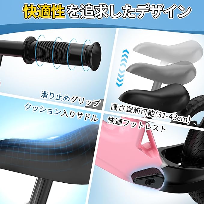 【心配りの行き届いた人間工学的デザイン】 このキッズバイクはシートの高さは31cmから43cmチまで調整可能で、子供の成長に合わせて変化します。クッション性のあるサドル、フットレスト、防滑ハンドルがデザインされており、コントロール力と快適さを向上させています。すべての詳細が丁寧に作られており、2歳以上の子供に楽しくアンゼンなライディング体験を提供します。