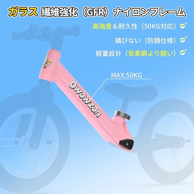 【軽量で耐久性のある高品質フレーム】 このペダルなし自転車はガラス繊維強化ナイロンフレームを採用し、強度は炭素鋼と同等で、50kgまでの重量に耐えられ、わずか3.2kgの軽さです。軽量で耐腐食性があり、親が持ち運ぶのにも便利で、特に家族のお出かけに最適です。