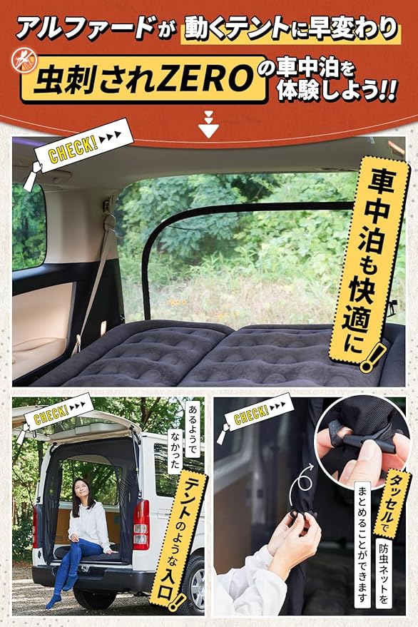 ✅【意匠権出願中のテント型入口デザイン】ありそうでなかったテント型の入口デザインを採用。アルファードを「動くテント」として活用でき、デザイン性と機能性を両立した独自設計で車中泊・キャンプ気分を盛り上げます。
