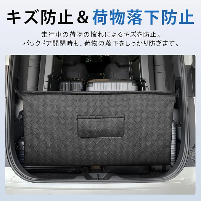 3.【多機能・大容量収納|保護・目隠し・落下防止】 大ポケット+小ポケットの組み合わせにより、荷物を種類別に整理しやすい設計。取り付け後は、走行中の荷物の偏りによるラゲッジ内壁のキズ防止に加え、バックドア開閉時の荷物の転落防止にも効果的です。また、外から荷物が見えにくくなるため目隠し用途としても活躍。さらに、重い荷物を積み下ろす際にはバンパー保護カバーとしても使用でき、実用性に優れた多機能収納バッグです。