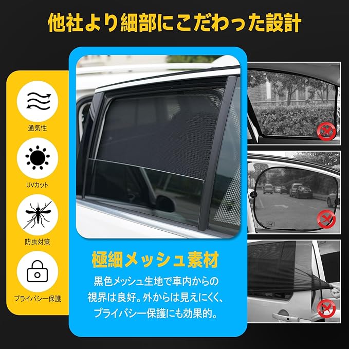 【車窓用防虫ネット】車窓を開けたいのに、虫が車内に入ってきて困ったことはありませんか?あるいは窓を開けて換気したいけど、太陽がまぶしくて目を開けていられないような経験は?当社の車窓用防虫ネットなら、これらの問題を完全に解決します。フロントとリアの4つの窓にぴったり合う専用設計で、お客様の車種に完璧にフィット。虫の侵入を防ぎながら快適な換気が可能で、まぶしい日差しも軽減します。爽やかな風を感じながら、ストレスのない体験をお約束します。