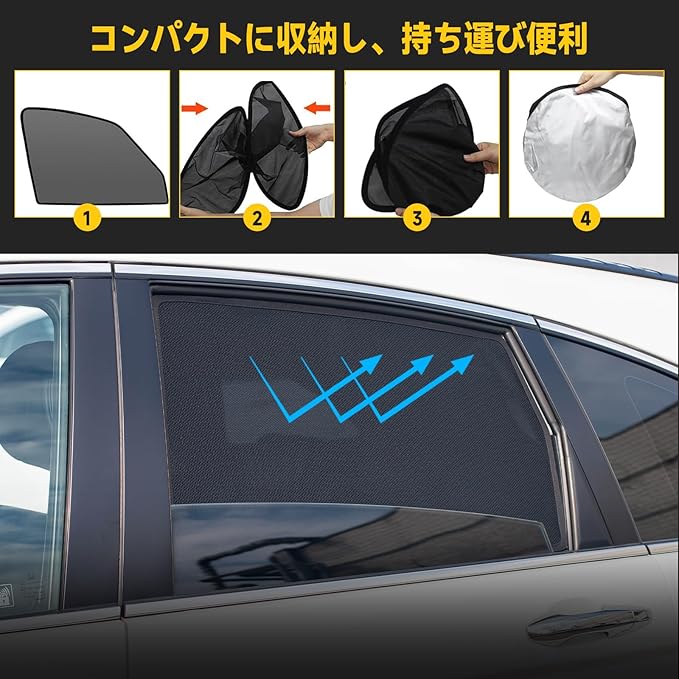 【通気性&UVカット】通気性に優れた高弾性メッシュ素材で、風通しを保ちながら虫の侵入を完全にブロックします。また、効果的に光を遮断できて、UVカット機能も兼ね備えます。特殊立体構造設計により窓の開閉に一切干渉せず、車中泊やアウトドア時でも換気効率を向上させて二酸化炭素濃度を低減します。エアコンの使用頻度を減らすことで燃費節約にもつながります。自然の風を感じながら蚊や虫の心配なしという、開放感あふれる快適なアウトドアをこの4枚で実現できます。