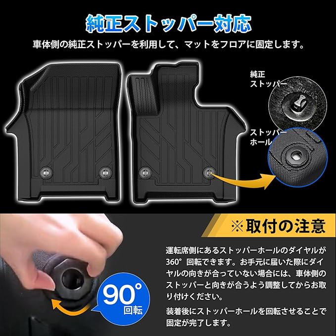 5.【ジャストフィット・純正ストッパー対応】車種専用設計なので、隙間なく装着し、純正品並みのフィット感を手に入れます!運転中の危険なズレを徹底的に防ぎ、運転の安全性を高めます!取付は純正マットを取り外してそのまま敷くだけです!女性1人でも簡単に装着できます。(純正回転ノブ式止め具に対応可能。※車種により異なる場合があります。)