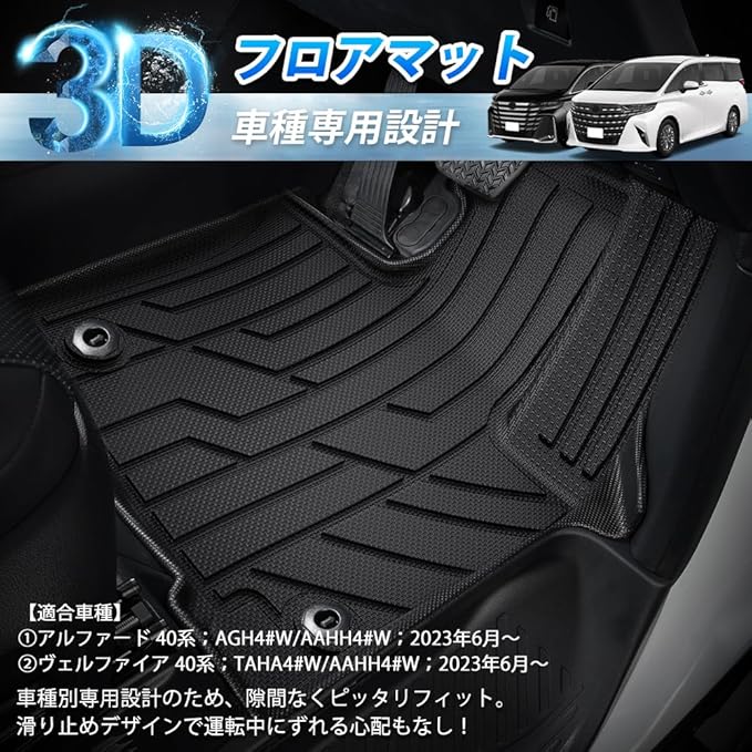 1.【適合車種】①トヨタ 新型 アルファード ALPHARD 40系; 型式:AGH4#W/AAHH4#W;年式:2023年6月~現行;②新型 ヴェルファイア VELLFIRE 40系;型式:TAHA4#W/AAHH4#W;年式:2023年6月~現行;ガソリン ハイブリッド車対応;「セット内容」3D フロアマット:運転席用1pcs、助手席用1pcs、(合計2PCSセット)。