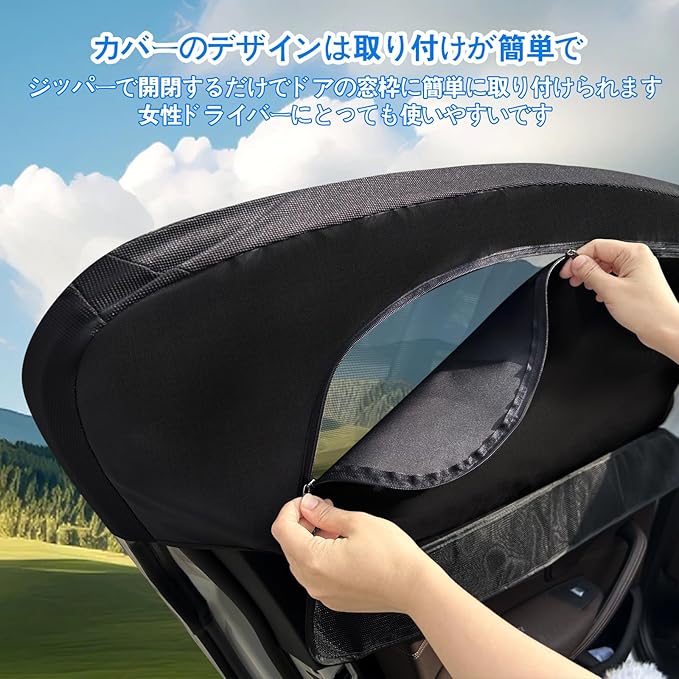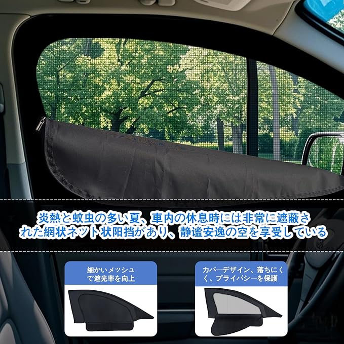 【用途が幅広い】夏の強い日差しの時に、強烈な日光を遮り、車内温度の上昇や内装の老化を最小限に抑えることができます。黒色の日除け面は日焼け防止に加え、プライバシー保護としても利用できます。また、車中泊や駐車時にも、自動車用防虫ネットが必要で、車窓を開けたままでも虫の侵入を心配する必要がありません!車内での食事、昼寝、読書などが快適になります。キャンプや野外活動などのシーンでも活躍します