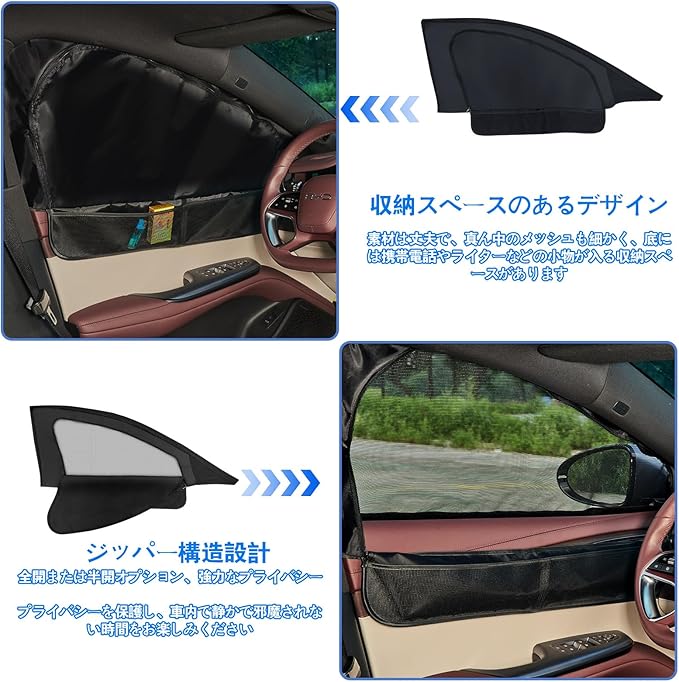 【取り付け簡単、収納可能】道具を使わずに、ネットを上から被せて、車窓を完全に覆い、マジックテープで固定するだけで取り付け完了です!使用しないときは、簡単に折りたたんで収納できます。コンパクトに折りたためるので、ドアポケットなどに収納しておくことができ、必要なときに簡単に取り出せます。下部には収納スペースがあり、傘やスマホ、時計などの小物を収納することができます