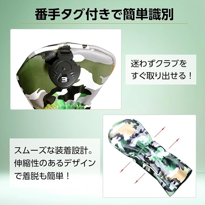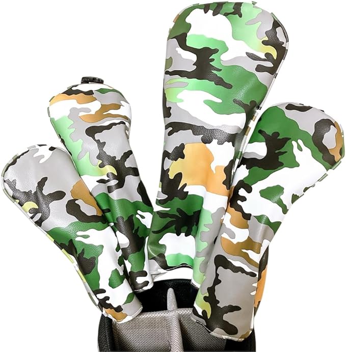 迷彩デザイン: スタイリッシュな迷彩柄のゴルフヘッドカバー4点セット。ドライバー、フェアウェイウッド、ユーティリティーに対応
