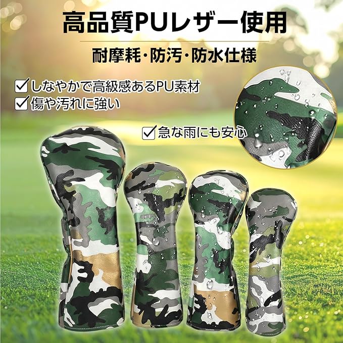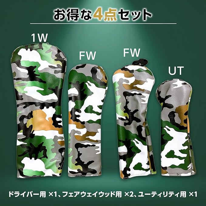 ゴルフクラブ ヘッドカバー 4点セット 迷彩柄 ドライバー フェアウェイウッド ユーティリティー用 防水仕様 PUレザー 番手タグ カモフラージュ グリーン 1W FW UT