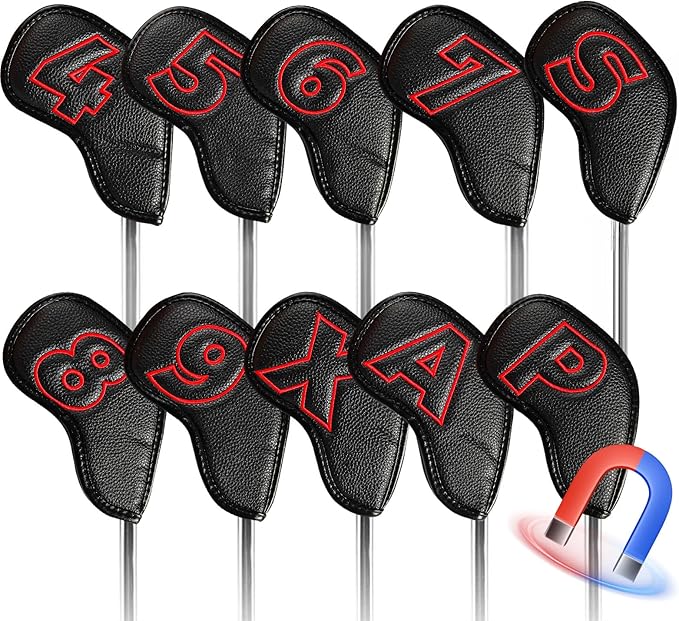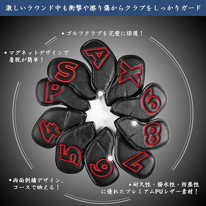 ゴルフアイアンカバー 10枚セット マグネット式開閉 ゴルフヘッドカバー ウェッジカバー 高級PUレザー 軽量 耐久性・撥水性・防塵性・耐摩耗 両面番号刺繍 究極のヘッド保護カバー LT-011