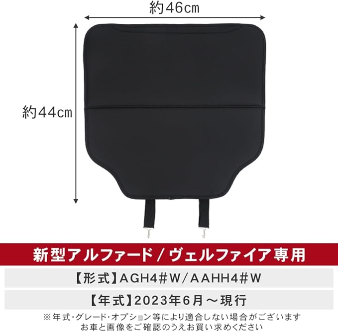 【セット内容】キックガード 2点 【サイズ(約)】46cm 44cm 【カラー】ブラック 【材質】マイクロファイバー+フェイクレザー 【適合車種】新型アルファード/ヴェルファイア40系 【形式】AGH4#W/AAHH4#W 【年式】2023年6月~現行 ※年式・グレード・オプション等によって適合しない場合がございますので、ご購入の際はお車と画像を必ずご確認ください。