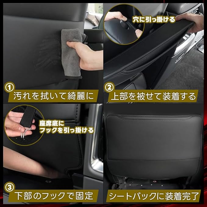 《設置方法》1:設置前にシートバックに付着している埃や油分などをタオルで拭き取ります。2:シートバックのポケットの上から被せて穴に引っ掛けます。3:本体に付いているフックをシートの底部に固定したら設置完了です。
