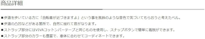 ■歩道を歩いている方に「自転車が近づきますよ」という事を風鈴のような音色で気づいてもらおうと考えたベル。■歩道の凸凹などがある箇所で、自然に揺れて音がなります。■ストラップ部分にはVIVAコットンバーテープと同じものを使用し、スナップボタンで簡単に着脱ができます。■ストラップ部分のカラーも豊富で、車体に合わせてコーディネートできます。