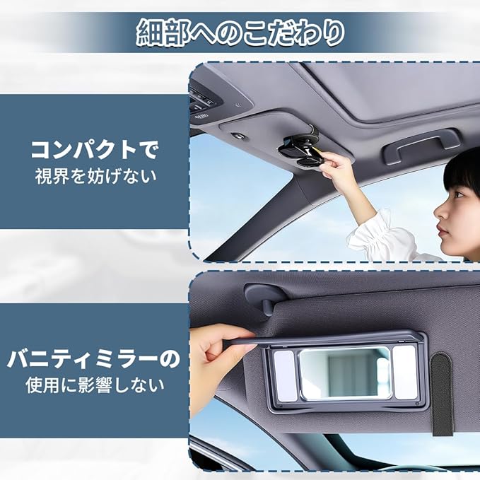【視界確保 使用に影響なし】この車載眼鏡クリップのサイズは11x6x2で、運転中にドライバーの視界を妨げることなく、安全に使用できます。また、バニティミラーの使用にも影響を与えず、傷めることもありません。注:サングラスケースは、非常に大きなデザインのサングラスには合わない場合がありますので、注文する前にサングラスのサイズに注意してください。