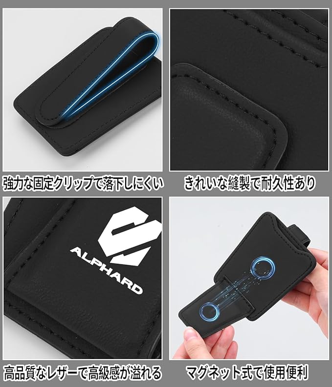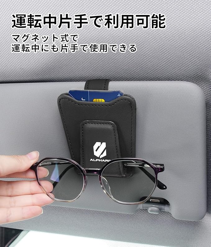 アルファード 専用 車用 メガネホルダー ALPHARD 専用ロゴ 薄型 サングラスホルダー アルファード 20系 30系 40系 適用 片手使用 車 カード 駐車券 ホルダー 取付簡単 眼鏡クリップ 車用収納 マグネット式 レザー製 サンバイザー取付 多機能(ブラック,アルファード 専用)