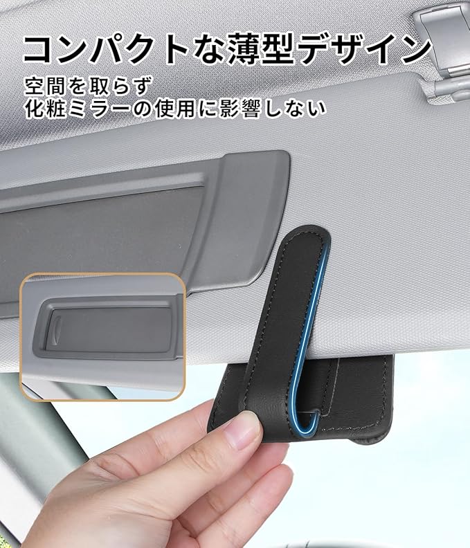 【取り付け簡単・しっかり固定】この サングラスホルダー は、車内で簡単に取り付けることができます。より幅広い大きさの背面クリップをサンバイザーに差し込んでしっかり固定できます。また、高品質なPUレザーに包まれる金属クリップはサンバイザーにも傷つけません。