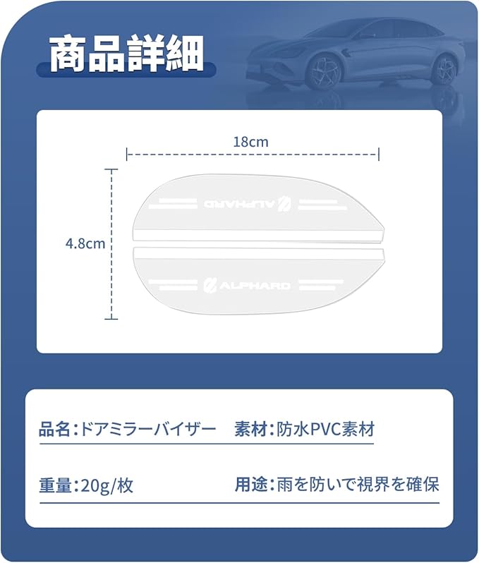 【ご愛車の格調を高めるデザイン】このドアミラーバイザーは ALPHARD 専用ロゴが付き、透明な素材とシンプルで高級感のあるデザインがご愛車の個性を際立たせます。実用的であると同時に、ご愛車を飾ってその格調を高めます。【適用車種】アルファード 20系 30系 40系対応します。