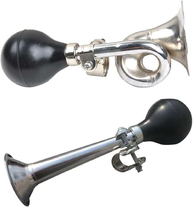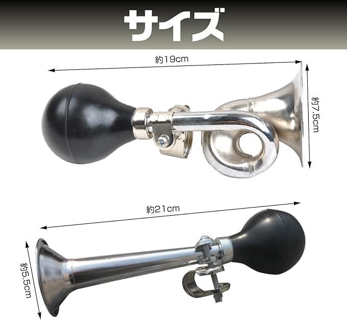 【商品内容】自転車のハンドルに取り付けられるラッパホーン(渦巻き型とストレート型)の2個セットです。 ラバー部分を押すだけで簡単に音が出るラッパは昔懐かしい「パフパフ」音色の違いを楽しめます。レトロなラッパホーン 応援グッズとしても使用できます。