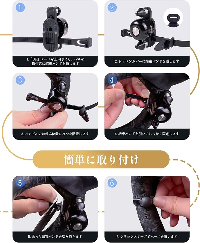 【工具不要・3秒取り付け】 エコの再利用可能ストラップ(3本付属)で、直径47mmまでのあらゆるハンドルに簡単設置。DIY不要で自転車アクセサリー初心者も安心。シリコンカバー付きで見た目もスッキリ。