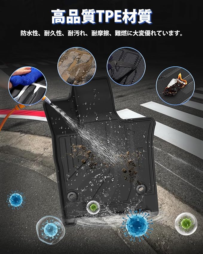 2.【高品質TPE材質】:環境にやさしい素材を採用します。TPE素材「熱可塑性エラストマー」と呼ばれる素材でプラスチックのように成型が可能で、ゴムのように弾力のある、両方の良い処取りの合成樹脂です。また、製品表面が特殊エンボス構造により繊細で立体的な凹凸が現れ、耐久性も優れています。耐汚れ、耐摩擦、難燃に大変優れており、適度な柔軟性を持っています。