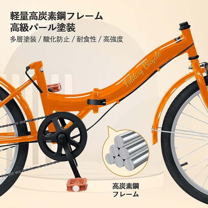 【高炭素鋼フレーム】自転車は高炭素鋼フレームを採用し、最大80kgの重量に耐えることができます。頑丈なフレームは振動吸収性に優れ、地面からの衝撃を適度に和らげ、長時間の走行による疲労を軽減します。フレーム表面は高級パール塗装加工が施されており、あらゆる悪天候や環境による腐食にも耐え、長寿命でご使用いただけます。