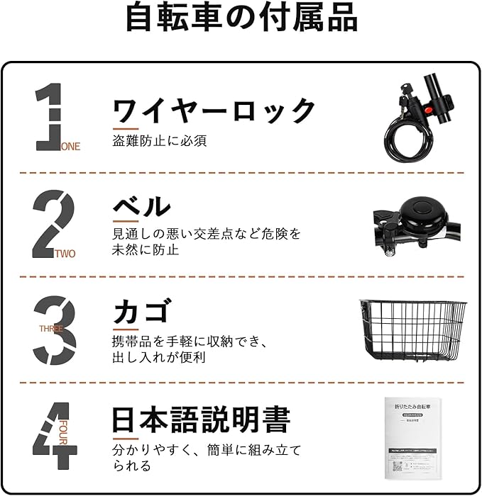 【安心のアフターサービス】折りたたみ自転車はワイヤーロック、ベル、カゴなどを同梱しております。1年保証付きで、ご連絡いただければ誠心誠意対応させていただきます。ご注意:自転車は大型商品のため、Amazonの返品受付センターで返品手続きをお受けできない場合がございます。その際は取扱説明書に記載されている連絡先までご連絡くださいませ。