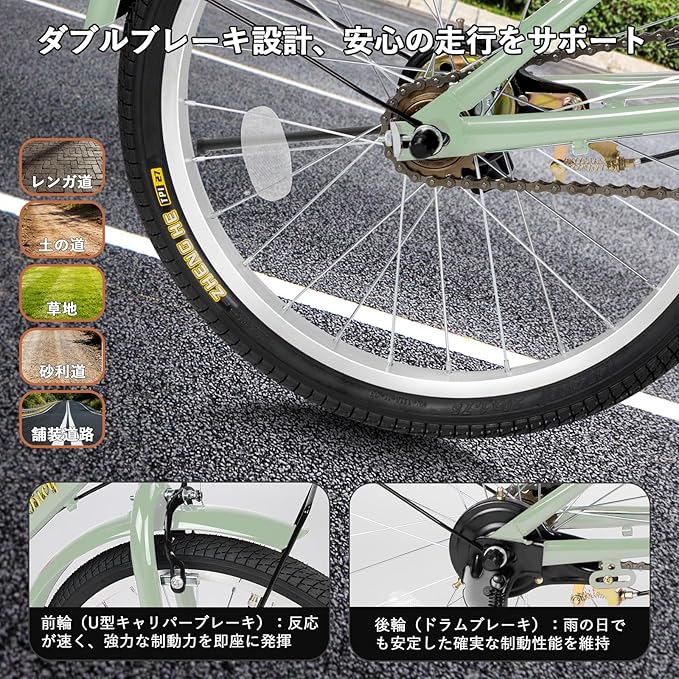 【優れた制動力】折り畳み自転車の前輪にはU型キャリパーブレーキ、後輪にはドラムブレーキを採用しており、素早い反応を実現します。強力なブレーキと耐摩耗性・滑り止め性に優れたタイヤが相まって、優れた制動力で走行中の安全を守ります。