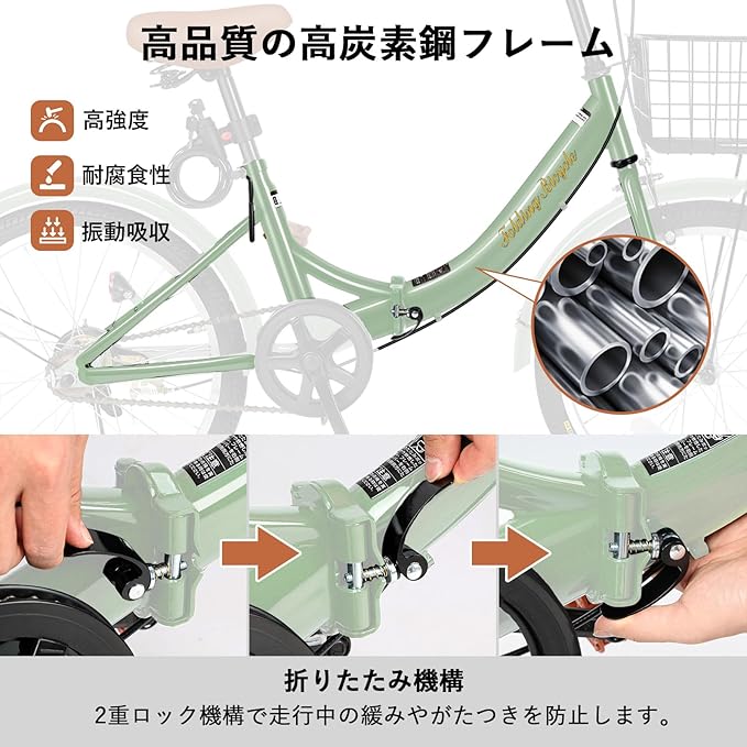 【折り畳み式デザイン】この20インチ 折りたたみ自転車は工具不要で、簡単に折り畳むことが出来ます。折り畳んだ後はコンパクトになり、玄関や車のトランク、オフィスの隅などにすっきり収納可能です。連結部分は強化構造を採用し、1万回以上の開閉テストを経ても安定性を保持します。携帯と収納の利便性を確保しながら、走行時の安全性もしっかりとサポートします。