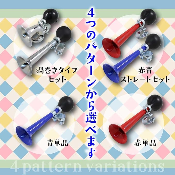 Funriche 自転車 ベル 自転車 ホーン ラッパ 音 警音器 レトロ ラッパホーン 応援 グッズ パフパフ音 取付簡単(渦巻&ストレート)(赤) (青)