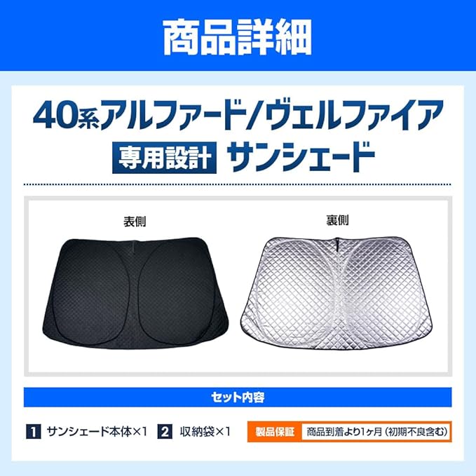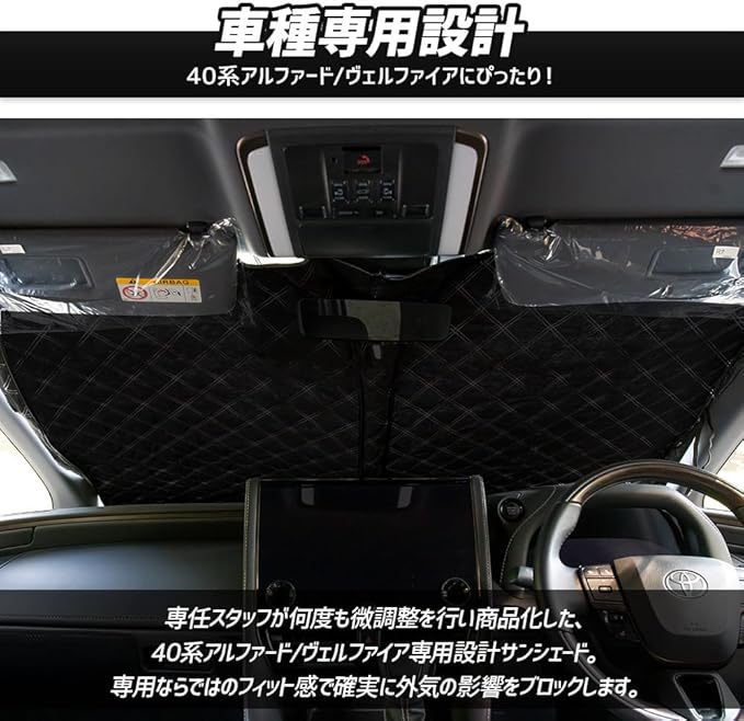 【車種専用設計】 専任スタッフが何度も微調整を行い商品化した、40系アルファード/ヴェルファイア専用設計サンシェード。 専用ならではのフィット感で確実に外気の影響をブロックします。