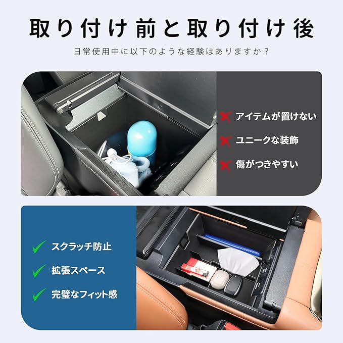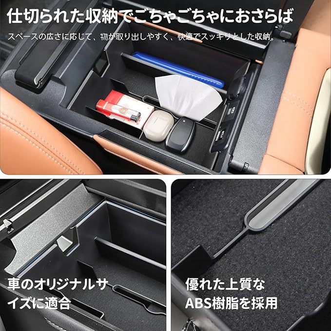 【素材】コンソールトレイ素材:高品質ABS樹脂製 (耐高温) ラバーマット素材:高品質なゴム(滑り止め加工済み)。防塵・防キズ・騒音なし、汚れた場合は水洗いして繰り返し使用できます。